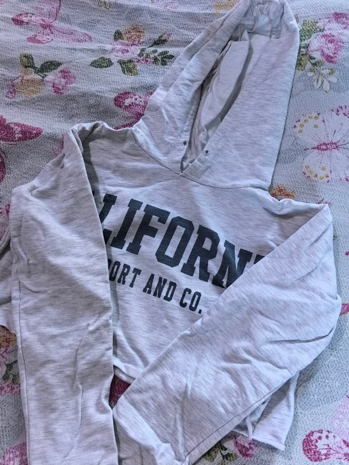 Gri renkli, kısa kesim kadın sweatshirtü, kapüşonlu ve ön kısmında baskılı yazıya sahiptir. Yumuşak pamuk kumaştan üretilmiş, rahat kesimdir. Xxs, xs ve s giyenler için uygundur✨