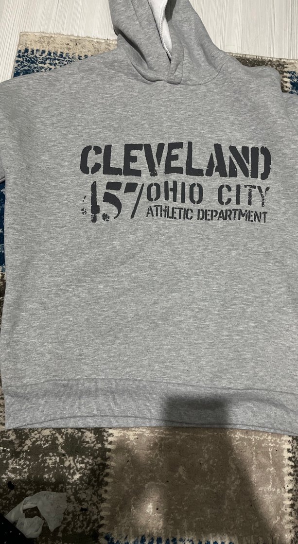 Bu gri pamuklu sweatshirt, uzun kollu ve kapüşonludur. Salaş kesim ve normal boydadır. Önünde 'CLEVELAND 157 OHIO CITY ATHLETIC DEPARTMENT' baskısı vardır, spor sokak stiline uygundur. ️