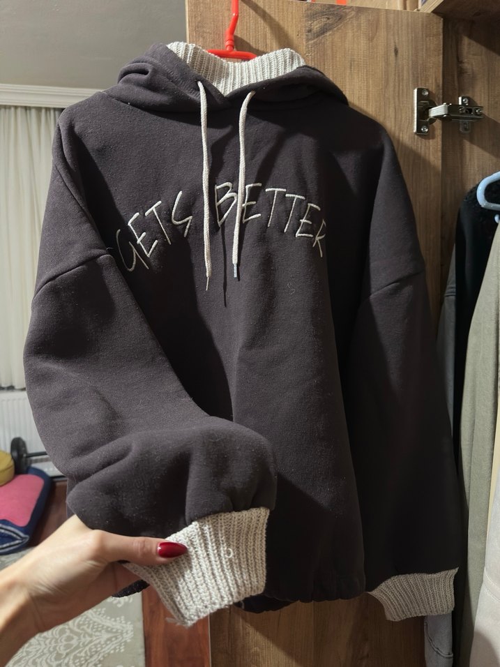 Kadın sweatshirtü, kapüşonlu ve fermuarlı ön kısmıyla, yumuşak kumaştan, bol kesimdir. Uzun kollu ve baskılı tasarıma sahiptir, günlük rahat stil için uygundur.