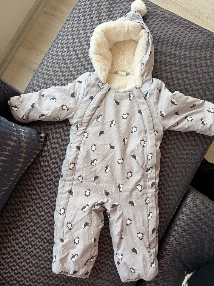 Gri renkli, kapüşonlu ve içi kürklü bebek tulumu. Penguen desenli ve soğuk havaya karşı koruma sağlar. ❄️ 2-4 ay H&M Astronot tulum neredeyse sıfıra yakın hiçbir defosu veya kirliliği yok bebekler için aşırı kullanışlı hem el hem ayakları kapanabilir formda kapşon dahil içi yumuşak tüylü malzemeden Unisex tulum. Fermuarları ayağa kadar açılabilirdiği için giydirip çıkartmak çok kolay oluyor çift taraftan fermuarlı .