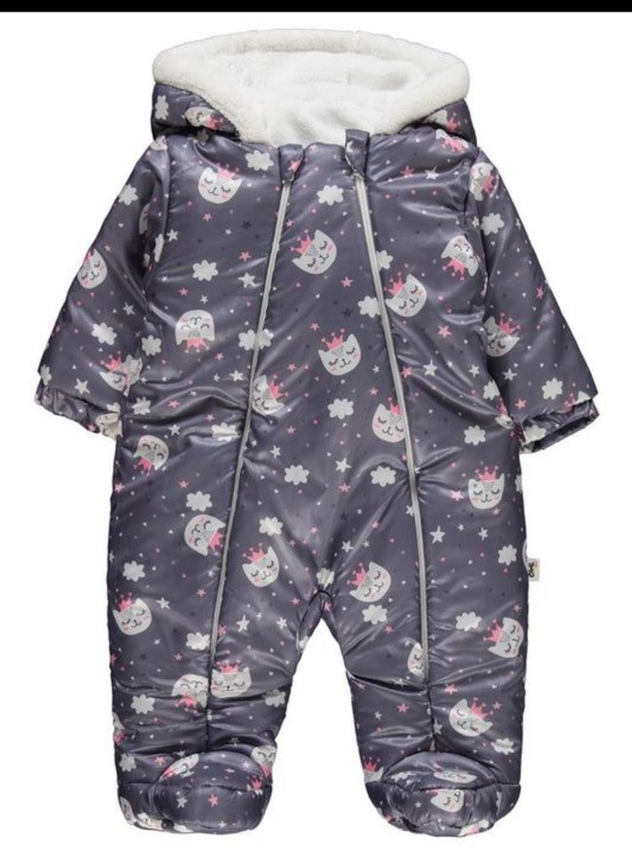 Gri kapüşonlu bebek kış tulumu, yumuşak kürk detaylı iç astar ve ay ile bulut desenli baskıya sahiptir. Kolay giyim için fermuarlı tasarıma sahiptir.