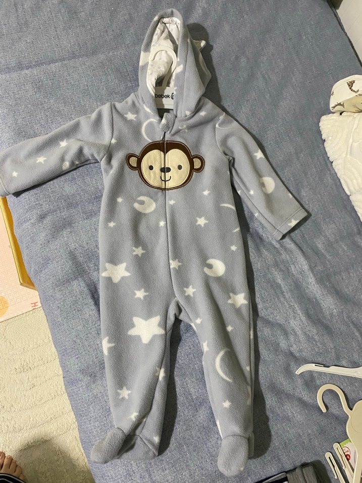 Yumuşak ve sıcak kumaştan yapılmış, yıldız ve ay desenli, kapüşonlu ve maymun figürlü kürk detaylı gri bebek tulumu. 2 kez kullandık bebeğim olmadığı için