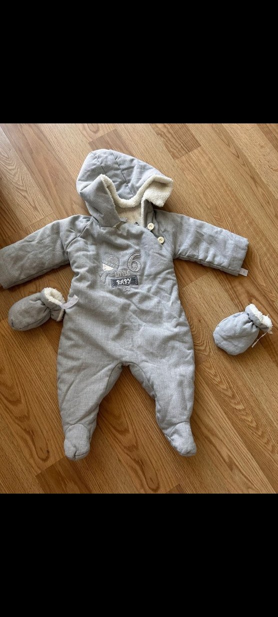 Gri renkte kapüşonlu ve düğmeli bebek tulumu, yumuşak ve sıcak kumaştan üretilmiştir. Eşleşen eldivenleriyle birlikte gelir. ❄️