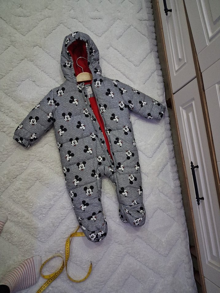 Gri renkli, Mickey baskılı bebek tulumu, yumuşak ve sıcak fleece kumaştan üretilmiş, fermuarlı ve kapüşonlu sokak stili tasarıma sahiptir.