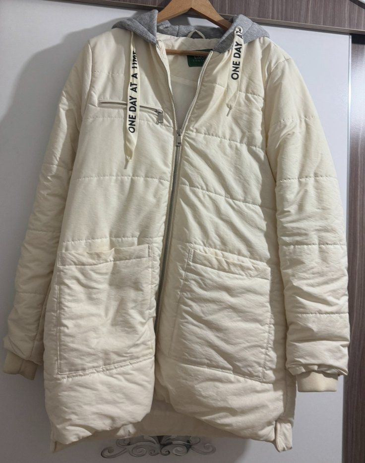 Gri kapüşonlu, fermuarlı ve uzun kollu beyaz kadın mont. Salaş kesim, yakası çentikli ve midi boyda, rahat sokak stili için uygundur.