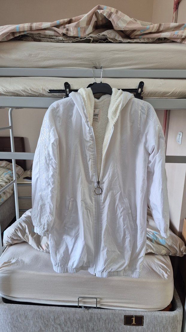 içi yüklü mevsimlik sadece küçük siyah bir leke var ama çıkar. Bol kesim, uzun kollu, yüksek yakalı ve fermuarlı beyaz kadın ceket. Yumuşak keten kumaştan, rahat kapüşonlu, günlük sokak stili için uygun.