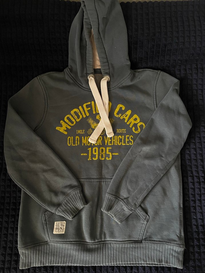 Gri kapüşonlu sweatshirt, baskılı vintage biker deseni ve 'MODIFIED CARS 1985' yazısıyla. Uzun kollu, bol kesim ve tokalı detaylı. Günlük kullanım için uygun. ️