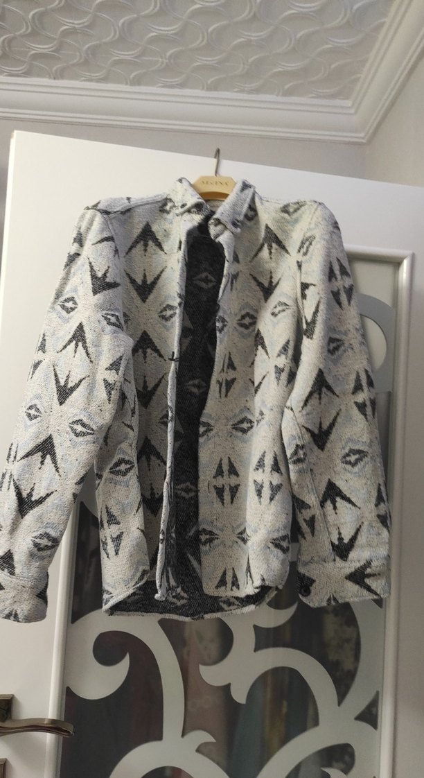 Yumuşak yünden, kapüşonlu ve uzun kollu, bol kesim gri kadın kazak. Örgü dokusu ve bohem desenli, rahat kullanıma uygun.
