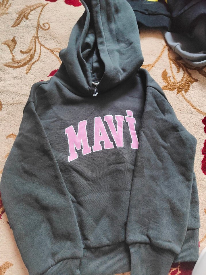 Gri kapüşonlu, uzun kollu ve bol kesim çocuk sweatshirt. mavi sweatshirt orijinal sıfır kullanılmamış 5/6 yaş
