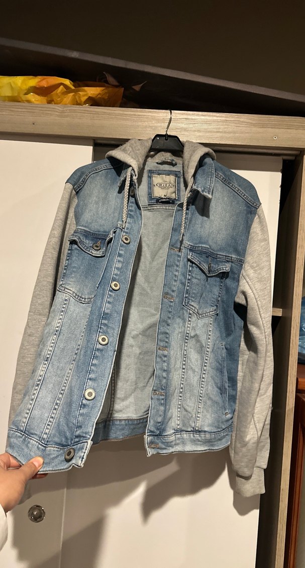 Gri renkte, kapüşonlu ve düğmeli önü olan bol kesim denim ceket. Uzun kollu, yaka detaylı ve gündelik sokak stili için uygun.