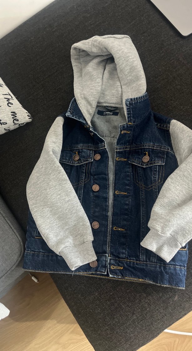 Fitted kesim erkek çocuk ceketi, denim gövde ve gri kapüşonlu kollara sahip. Önü düğmeli, yakası notched lapel, streetwear tarzında. Lcw marka