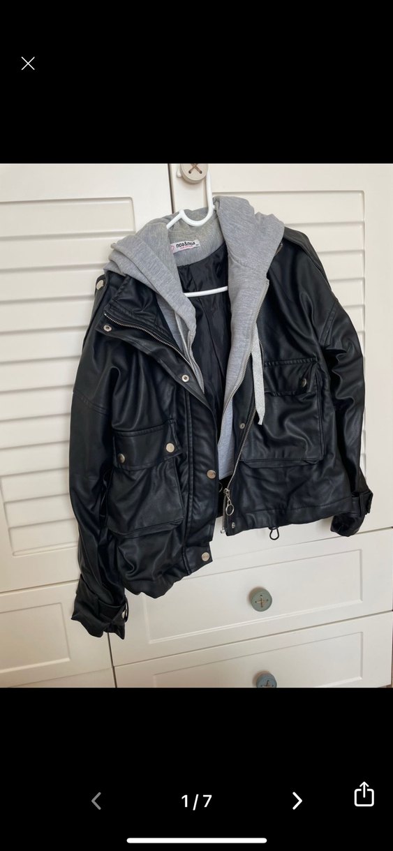 Bol kesim deri ceket, fermuarlı önü ve yüksek yakalı gri kapüşonlu iç kısmıyla sokak stilini rahatlıkla birleştiriyor. Sorunlarını görselde belirttim yaka kısmı yıkanacak ve sağ arka kısımda ve sol arka kısımda yırtılma var yapıştırılabilir diye düşünüyorum fiyat son
