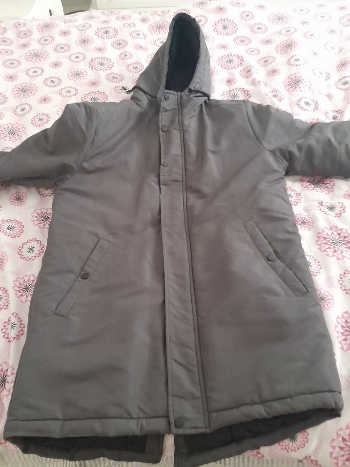 Gri renkli, kapüşonlu ve düğmeli erkek mont. Uzun kollu, yumuşak ve sıcak kumaştan, sokak stiline uygun, dar kesim. iki koltuk arası:62 cm boy:90 cm