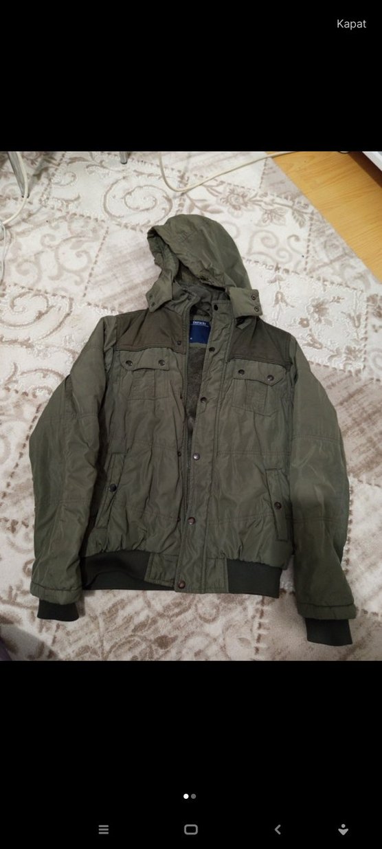 Erkekler için gri kamuflaj desenli, kapüşonlu, düğmeli ve uzun kollu rahat kesim mont. Sıcak tutan yumuşak kumaştan outdoor kullanım için uygundur.