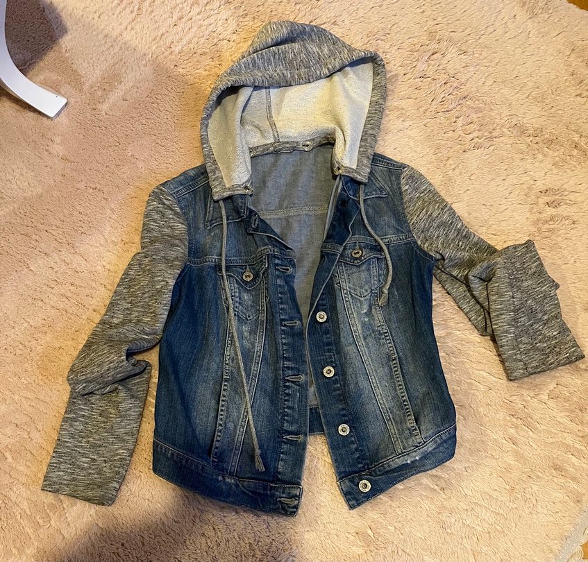 şapkası çıkarılabilir ,temiz ve defosu yoktur, uzun gri kollu kapüşonlu kadın denim düğmeli ön günlük kullanıma ideal. Markası mavi dir.
