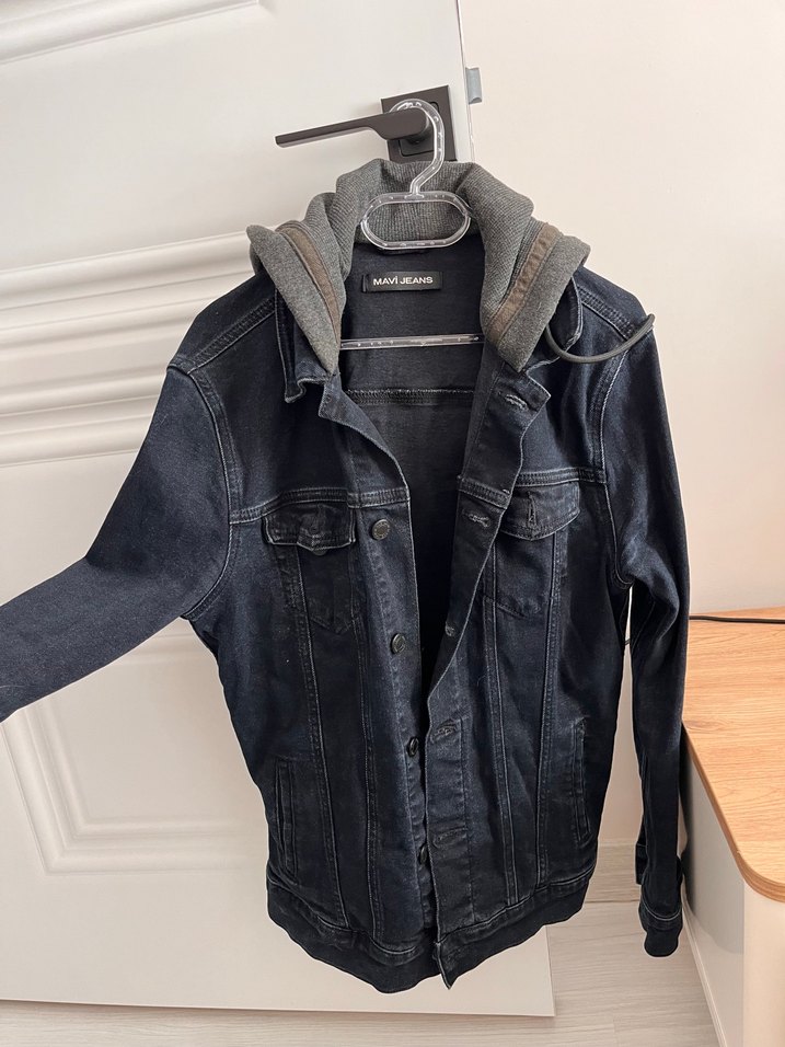 Düğmeli önü ve gri kapüşonlu detaylı, kesimi oturan erkek kot ceket. Uzun kollu, normal midi boyda, günlük rahat kullanıma uygun.