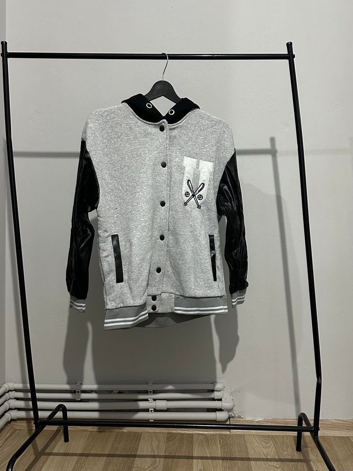 Gri renk, kapüşonlu ve düğmeli bu yelek, yumuşak fleece kumaştan üretilmiştir. Salaş kesimi ve baskılı deseniyle rahat sokak stili için uygundur. Kapşonlu baskılı kolej ceket M beden Cep detayları deri Kol detayları deridir İsteyene fotoğrafta ki gibi kolları sökülüp gönderilir o şekilde de kapşonlu yelek olucaktır.