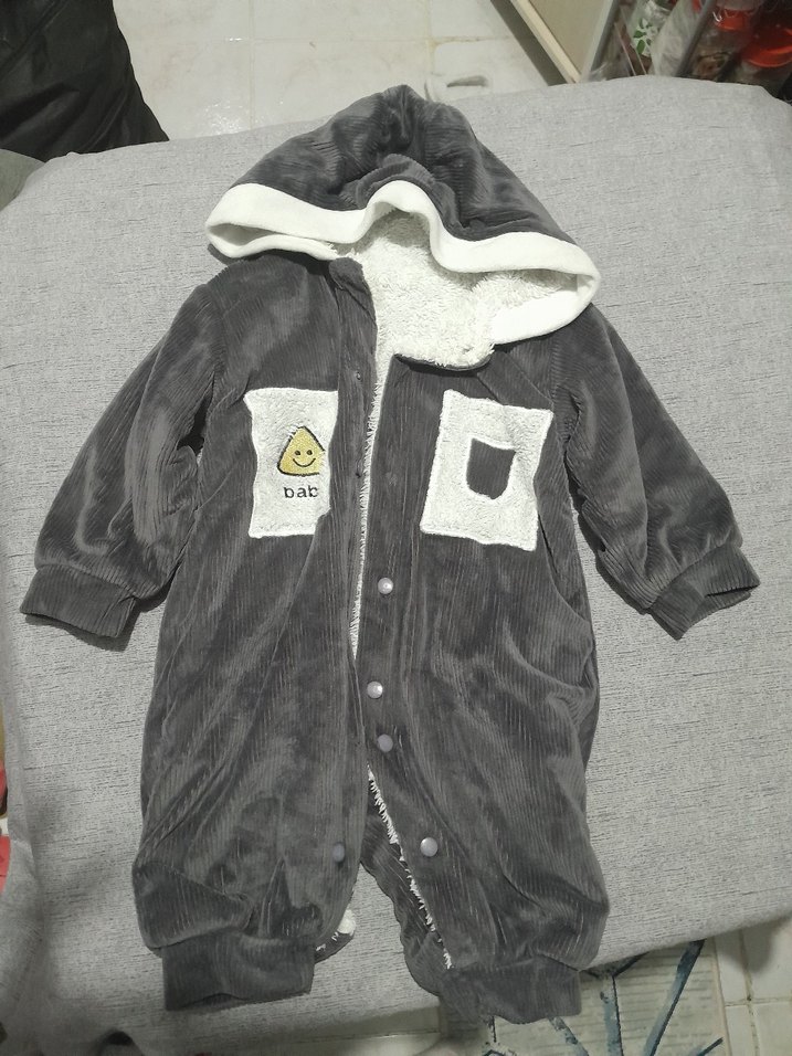 Gri renkli, kapüşonlu ve düğmeli erkek bebek tulumu, yumuşak polar kumaştan üretilmiştir. Üzerinde baskılı detaylar vardır. ❄️