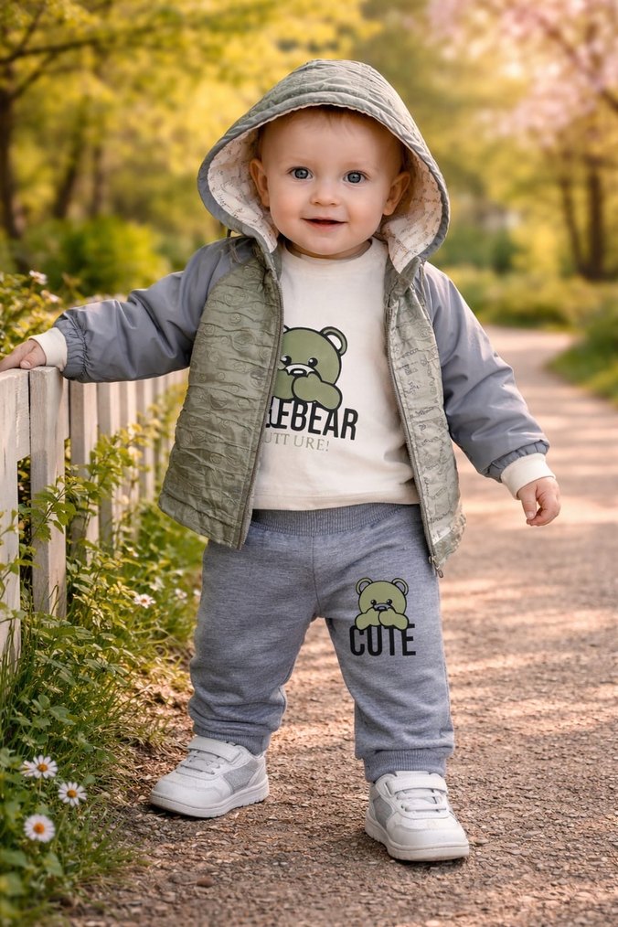 Gri kapüşonlu puff mont, baskılı uzun kollu üst ve eşofman altından oluşan yumuşak ve sıcak kumaş bebek takımı. Üzerinde LEBEAR ve COTE baskıları bulunur. (Yaka kısmı tozlanmış depoda kaldığı için bu nedenle fiyat düşüktür)