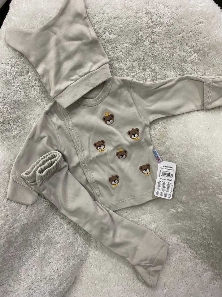 Gri kapüşonlu, düğmeli ve uzun kollu üst ile yumuşak kumaştan yapılmış ayıcık desenli erkek bebek takımı. Lastikli pantolon ile tamamlanmıştır.