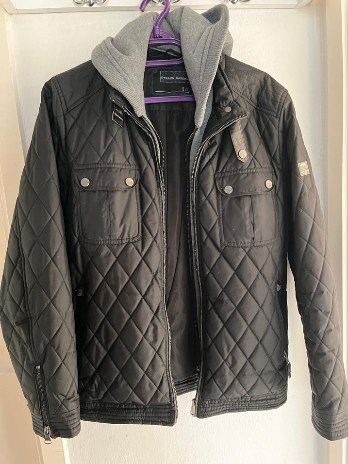 Gri kapüşonlu ve düğmeli cepleri olan siyah biker ceket, günlük kullanıma uygun uzun kollu ve regular fit yapıya sahiptir. Gri Kapüşon çıkarılabilir.