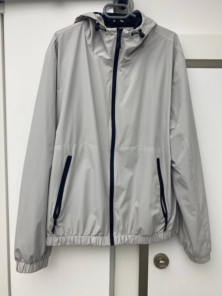 Gri renkte, sentetik kumaştan yapılmış, kapüşonlu erkek ceket. Fermuarlı, uzun kollu ve normal boyda, rahat kesimli dış mekan kullanımı için uygundur.