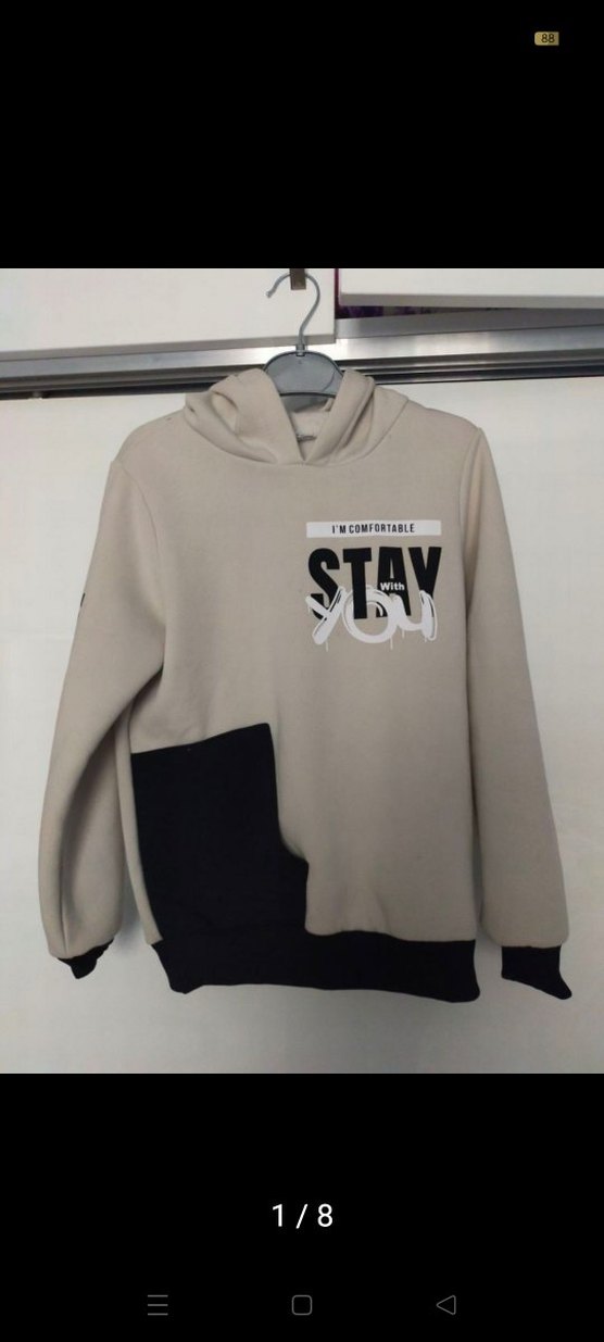 Gri renkli, kapüşonlu, uzun kollu ve bol kesim erkek çocuk sweatshirtü. Örme dokusu ve önünde "STAY" baskısı bulunur.