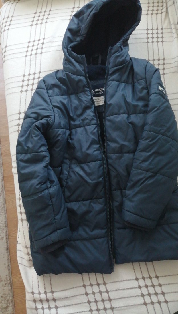 lacivert renkte, kapüşonlu ve fermuarlı, yumuşak ve sıcak kumaştan yapılmış, düz ve desen içermeyen, kesimli erkek çocuk kabanı. Notch yakalı ve tokalı detaylar bulunur.fermuar başı kopuk. fotoda ayrıntı var.