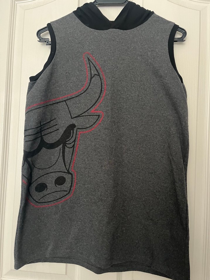 Yumuşak örme kumaştan, kolsuz ve yüksek yakalı gri erkek çocuk sweatshirt. Baskılı boğa deseni ve rahat kesimiyle sokak stilini yansıtıyor.