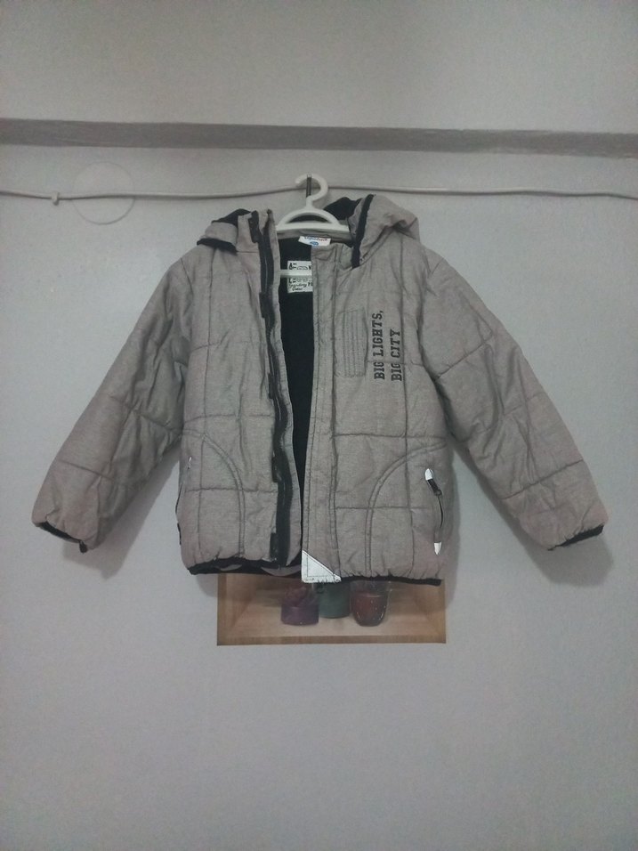 Gri renkli, kapüşonlu ve fermuarlı ceplere sahip, yumuşak dokulu erkek çocuk montu. Streetwear tarzında, dar kesimdir.