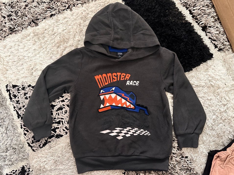 Gri renkte, kapüşonlu ve uzun kollu, bol kesim erkek çocuk sweatshirtü. Yumuşak ve sıcak kumaştan, önünde canavar yarış baskısı bulunur. Almanya’dan almıştım 5-6 yaş polar çok az giyildi