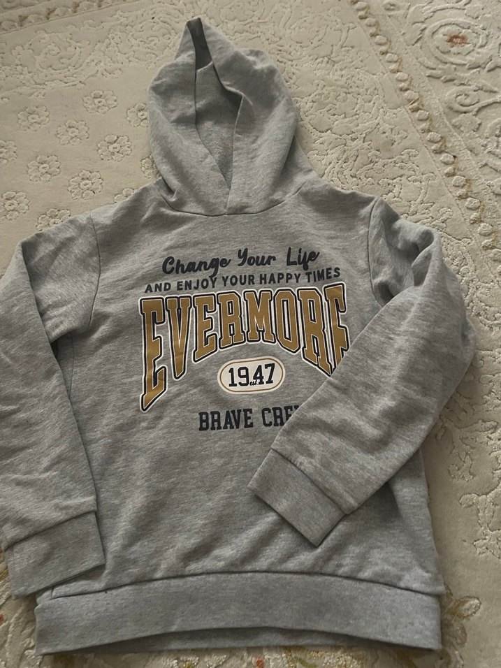 Gri kapüşonlu sweatshirt, uzun kollu ve bol kesimdir. Yumuşak ve sıcak kumaştan üretilmiş, baskılı yazılar ve kürk detayları bulunur.