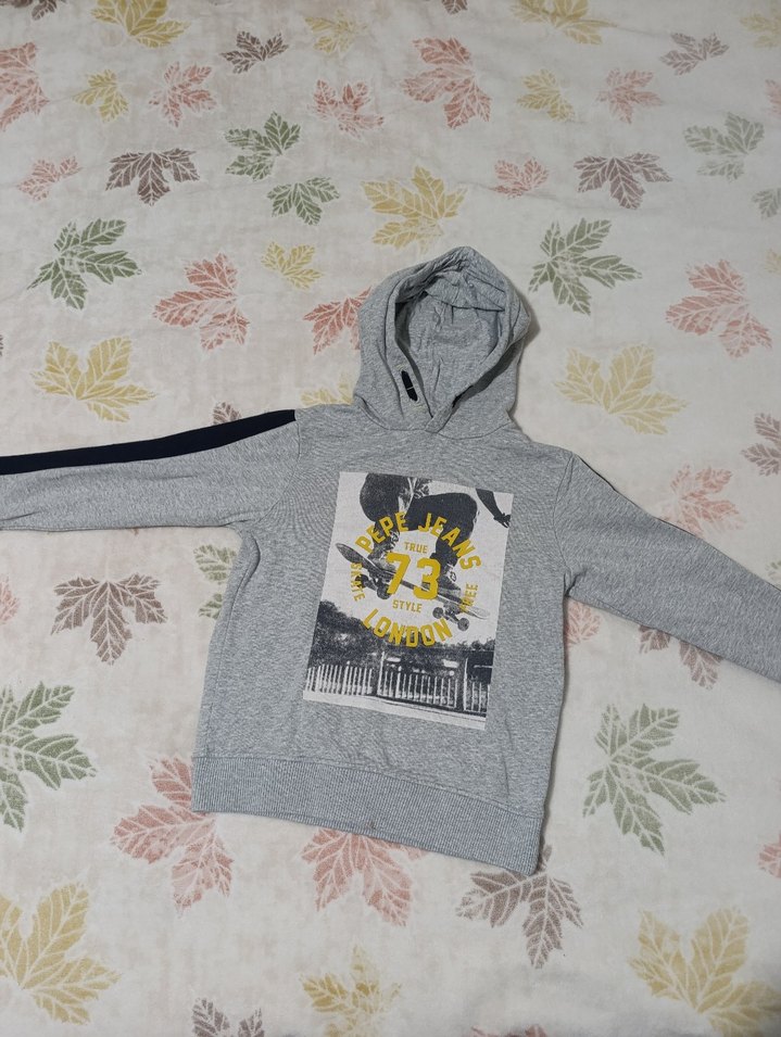Gri renk, kapüşonlu ve uzun kollu erkek çocuk sweatshirtü. Ön kısmında baskılı desen ve örme dokusu bulunur. Rahat kesimli ve günlük kullanıma uygun.