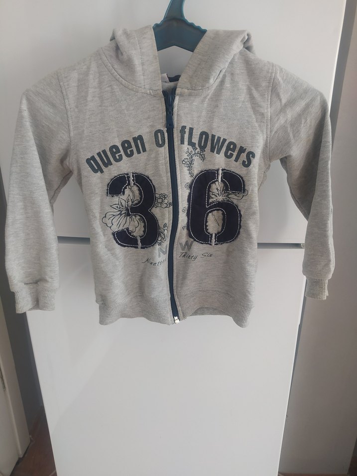 Gri renkli, kapüşonlu ve fermuarlı erkek çocuk sweatshirtü. Uzun kollu, bol kesim ve baskılı detaylara sahip, yumuşak ve sıcak kumaştan üretilmiştir.