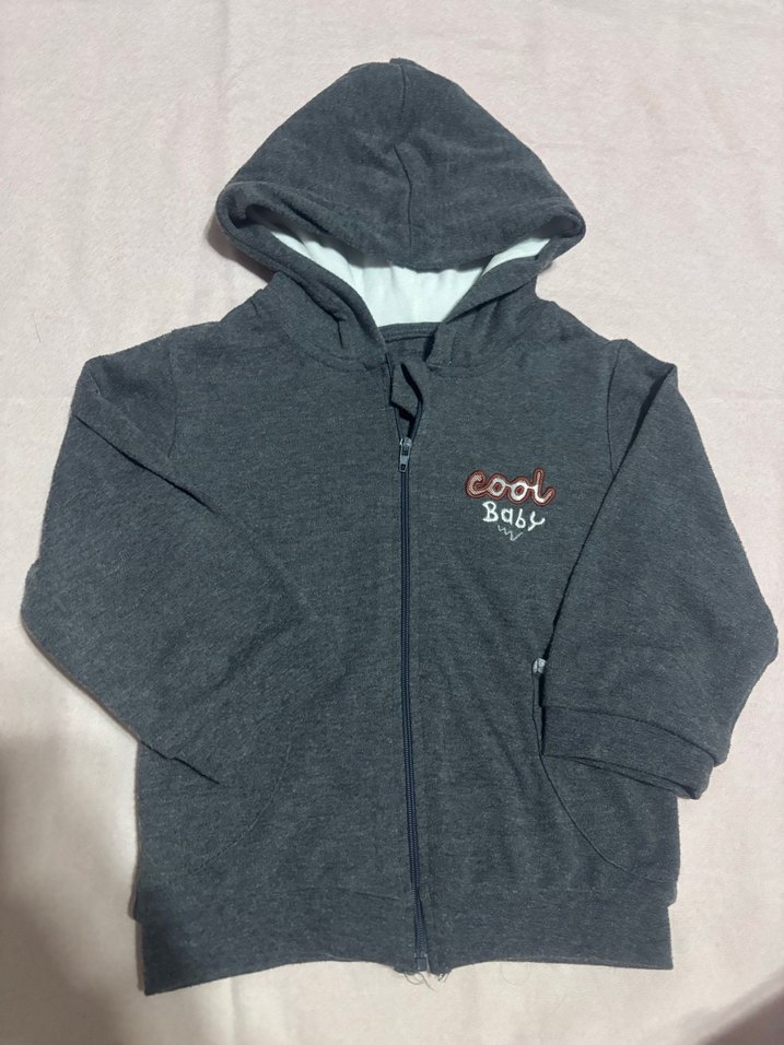 Gri renkte, kapüşonlu ve fermuarlı, uzun kollu, baskılı "Baby" yazılı, fit kesim erkek çocuk sweatshirtü. Yumuşak ve sıcak kumaştan üretilmiştir.