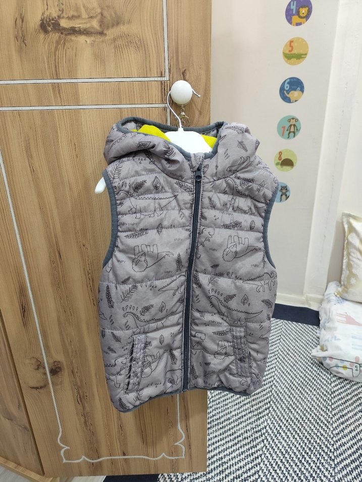 Bu erkek çocuk yeleği, yüksek yakalı ve fermuarlı olup, yumuşak ve sıcak kumaştan üretilmiştir. kapüşonda çok ufak kırmızı Keçeli kalem izi var makinaya atılsa geçer ben atmadım oglun 1 kış giydi temizdir o leke dışında sorunu yoktur.24-36 aylık içindir