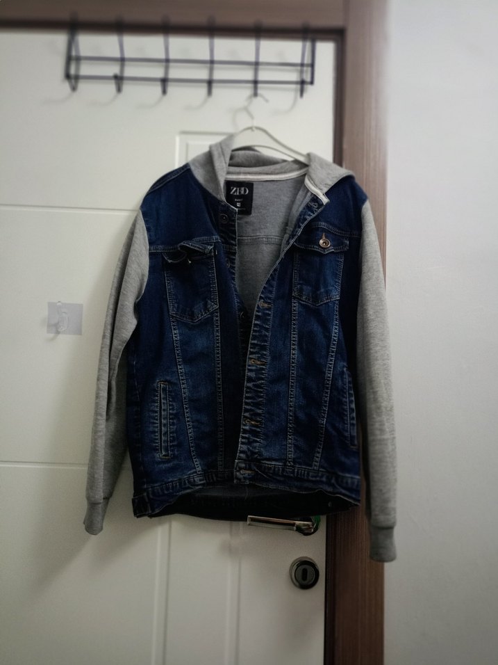 erkekler için gri kapüşonlu ve uzun kollu, fermuarlı, bol kesim denim ceket. Notch yaka ve günlük kullanıma uygun rahat tarzda. s m l beden