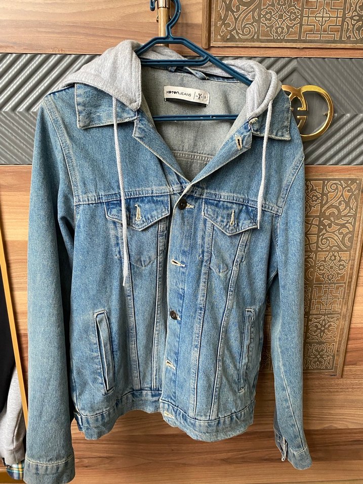 Gri kapüşonlu, düğmeli, kapüşonu çıkarılabilir temiz kullanıldı Günlük kullanıma uygun casual tarz.