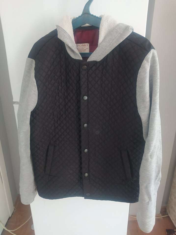Düğmeli önü, uzun kollu ve yuvarlak yakalı erkek ceket. Siyah kapitone gövde ile gri kollu ve kapüşonlu, rahat kesim ve yumuşak kumaşla günlük kullanıma uygun.