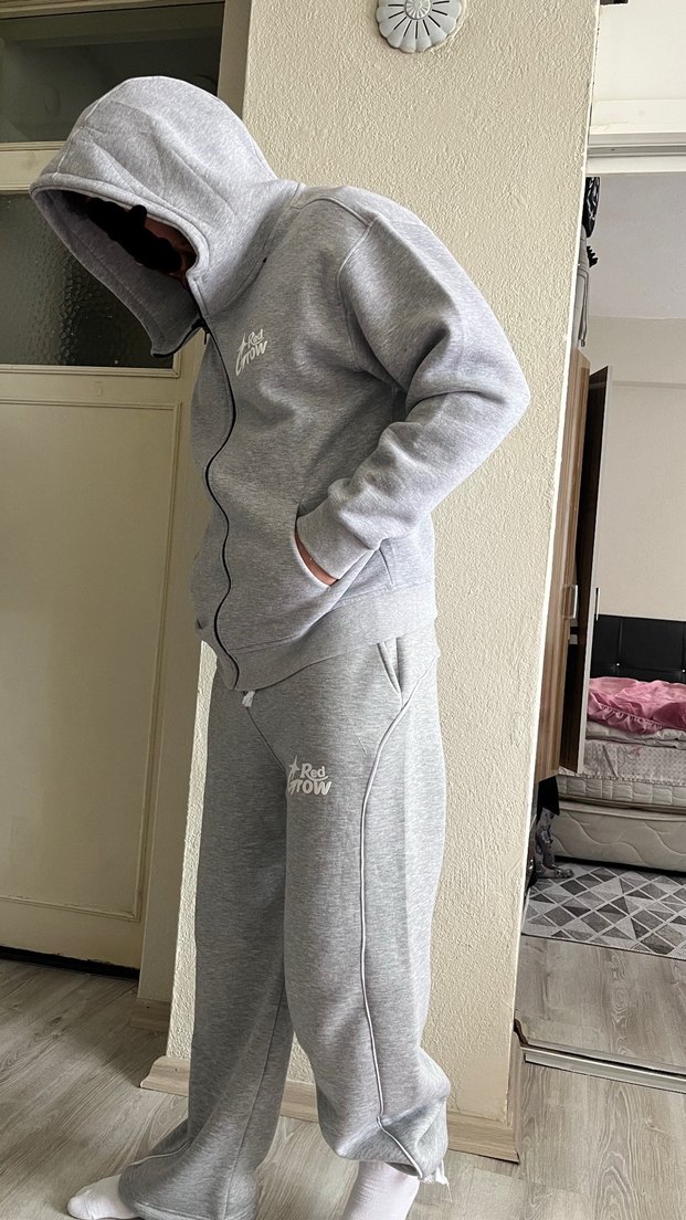 Gri renkli, kapüşonlu ve fermuarlı ceplere sahip sıfır ürün erkek eşofman takımı, ayrı ayrı da satımı mevcut beden aralığ S-M-L-XL elimizde mevcut