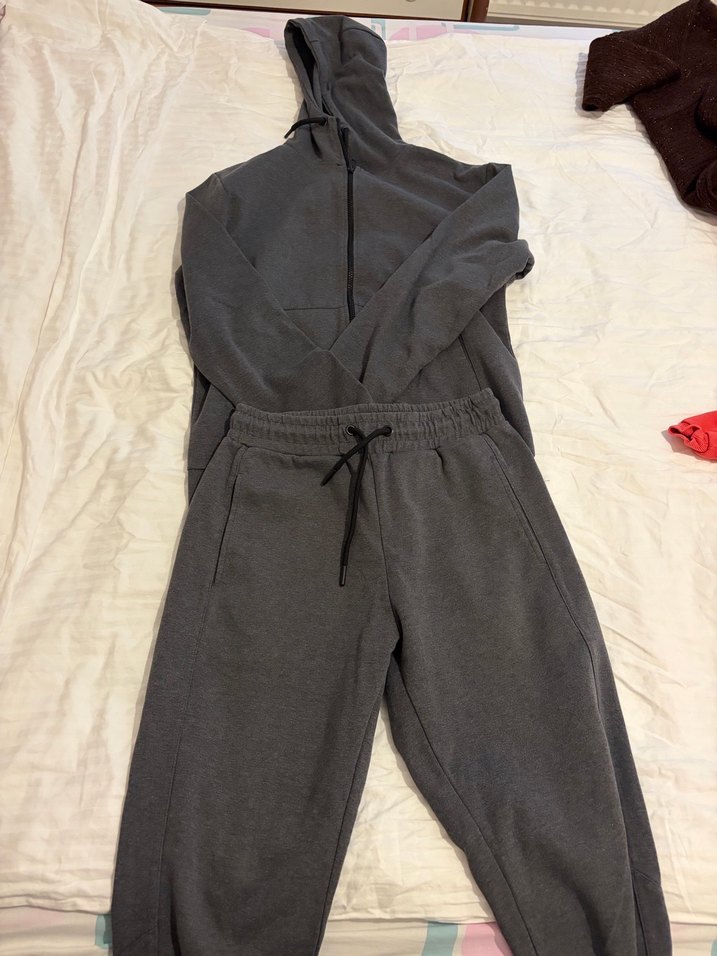 Gri renkli, yüksek yakalı ve fermuarlı kapüşonlu sweatshirt ile elastik bel ve bağcıklı eşofman altından oluşan erkek eşofman takımı. Yumuşak ve sıcak kumaşlıdır.