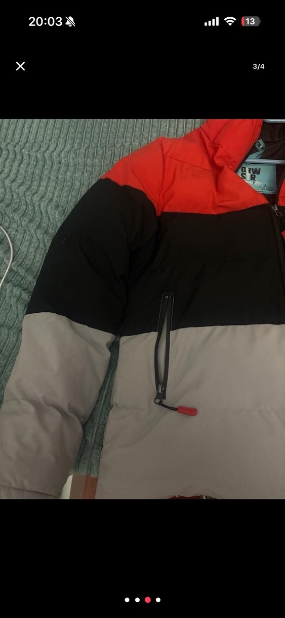 Yüksek yakalı, fermuarlı cepli, vücuda oturan kesime sahip erkek kayak montu. Gri, siyah ve kırmızı renk bloklu, yumuşak ve sıcak kumaştan üretilmiştir.