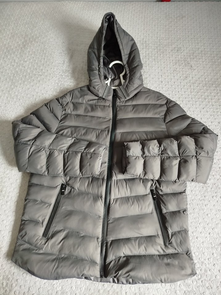 Gri renkli, fermuarlı ve kapüşonlu kadın kışlık mont. Yumuşak ve sıcak fleece kumaştan, midi boyda ve uzun kollu, rahat ve şık sokak stili için uygun. sorunu yok küçük geldiği için satışta