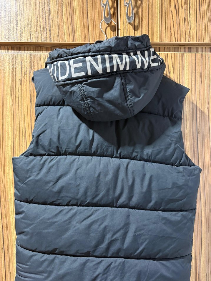 Gri kapüşonlu, şişme ve fermuarlı erkek yelek. Dar kesim ve rahat sokak stiline uygun, dış mekan kullanımı için ideal. S bedendir. Koltuk altı sadece birazcık sökülmüştür.