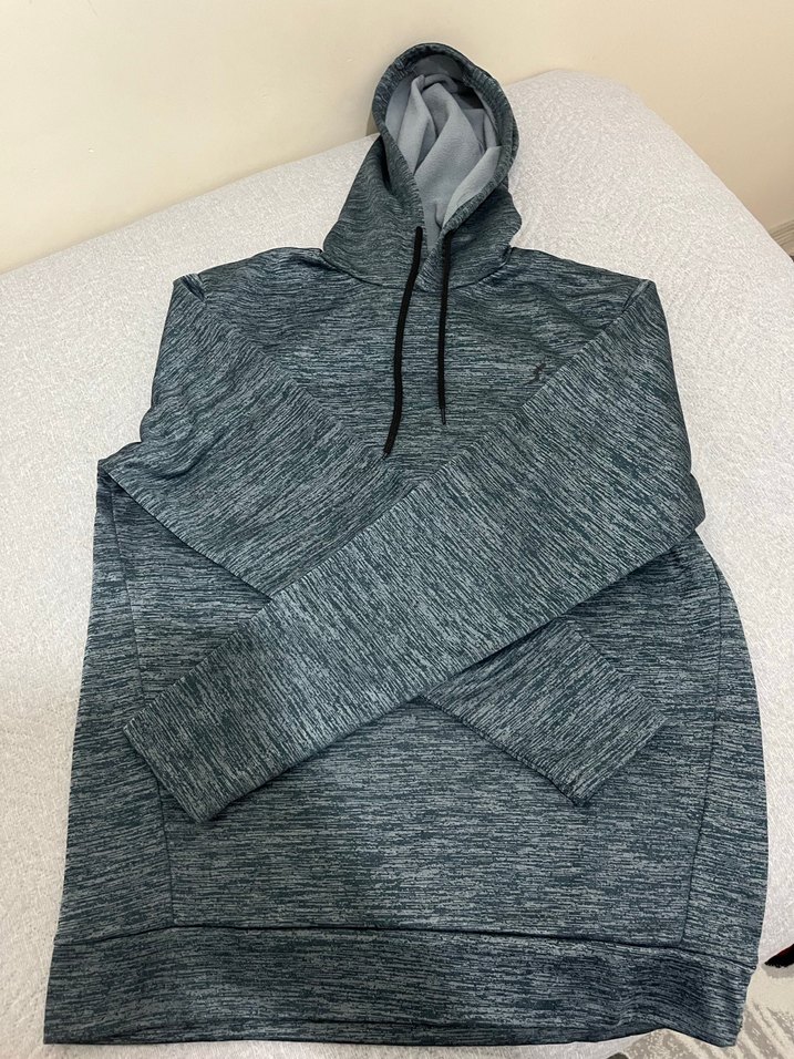 Gri kapüşonlu sweatshirt, uzun kollu ve bol kesimdir. Yumuşak örme sentetik kumaştan üretilmiştir ve spor ile günlük kullanıma uygundur. ♂️