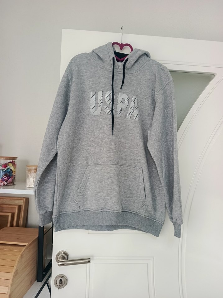 Gri kapüşonlu sweatshirt, bol kesim ve uzun kollu. Yumuşak kumaştan, önünde 'USPA' yazısı ve cep bulunur. Rahat günlük kullanım için ideal.