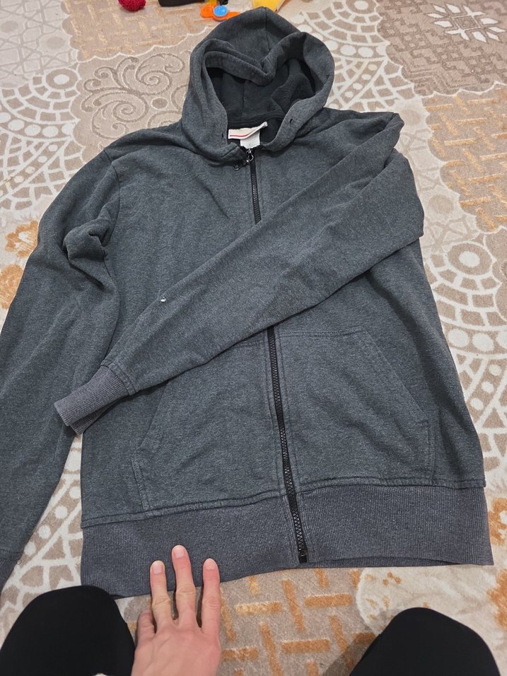 Gri renkli, kapüşonlu ve fermuarlı erkek sweatshirt. Yumuşak ve sıcak kumaştan, uzun kollu ve cepli tasarıma sahiptir. Günlük rahat kullanım için uygundur.
