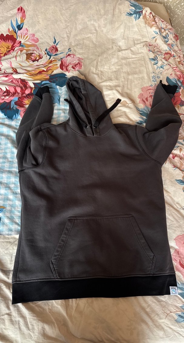 Koyu gri renkli kapüşonlu sweatshirt, rahat kesim ve uzun kolludur. Yumuşak kumaştan üretilmiş, drapeli tasarıma ve ön cep detayına sahiptir. Yurt dışı hediye geldi
