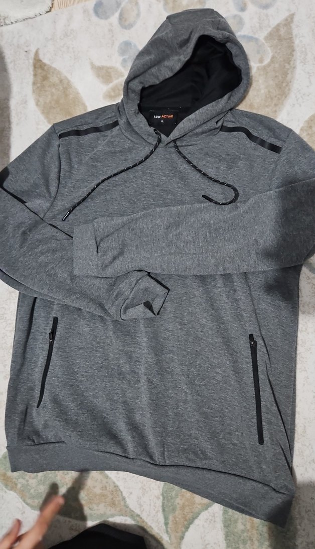 Gri renkli, kapüşonlu ve fermuarlı cepler içeren erkek sweatshirtü. Uzun kollu, rahat kesim ve yumuşak kumaştan üretilmiştir.