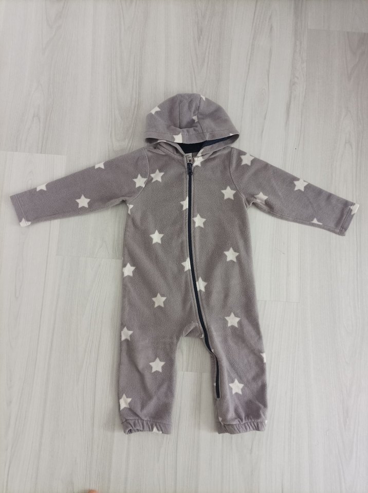 Bu bebek tulumu, kapüşonlu yakaya ve uzun kollara sahiptir. Yumuşak ve sıcak kumaştan yapılmış, gri renkte, fermuarlı ve yıldız desenlidir.